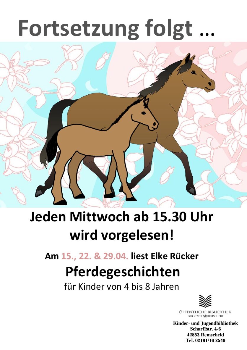 In den kommenden Wochen (15., 22. & 29.04.) können sich Kinder im Alter von 4 bis 8 Jahren auf Pferdegeschichten, vorgetragen von Elke Rücker, freuen.