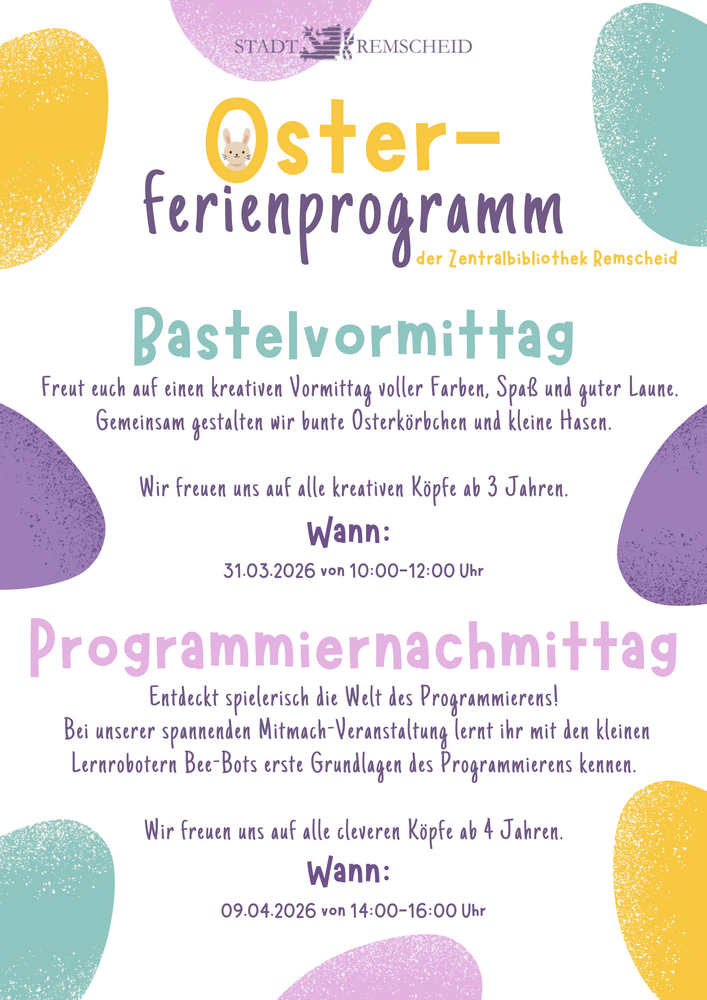 Basteln, malen, programmieren - an zwei Tagen in den Osterferien gibt es in der Kinder- und Jugendbibliothek im Kommunalen Bildungszentrum der Stadt Remscheid ein Ferienprogramm. Am Dienstag, den 31.03.2026 in der Zeit von 10 Uhr bis 12 Uhr sind Kinder ab 3 Jahren zu einer Oster-Bastelaktion eingeladen, bei der kreative Osternester sowie bunte Hasen gebastelt werden. Am Donnerstag, den 09.04.2026 dreht sich für Kinder ab 4 Jahren in der Zeit von 14 Uhr bis 16 Uhr alles um das erste Programmieren mit Bee-Bots. Die kleinen Bienenroboter lassen sich anhand von Richtungstasten bewegen. So werden sowohl das räumliche Denkvermögen als auch das mathematische Verständnis der Kinder auf spielerische Weise gefördert.