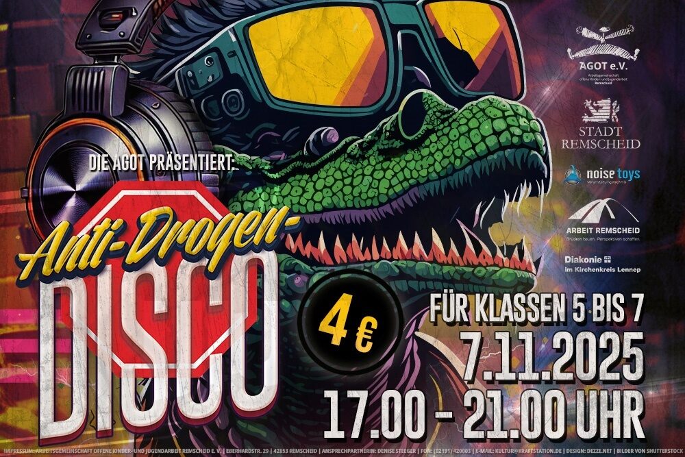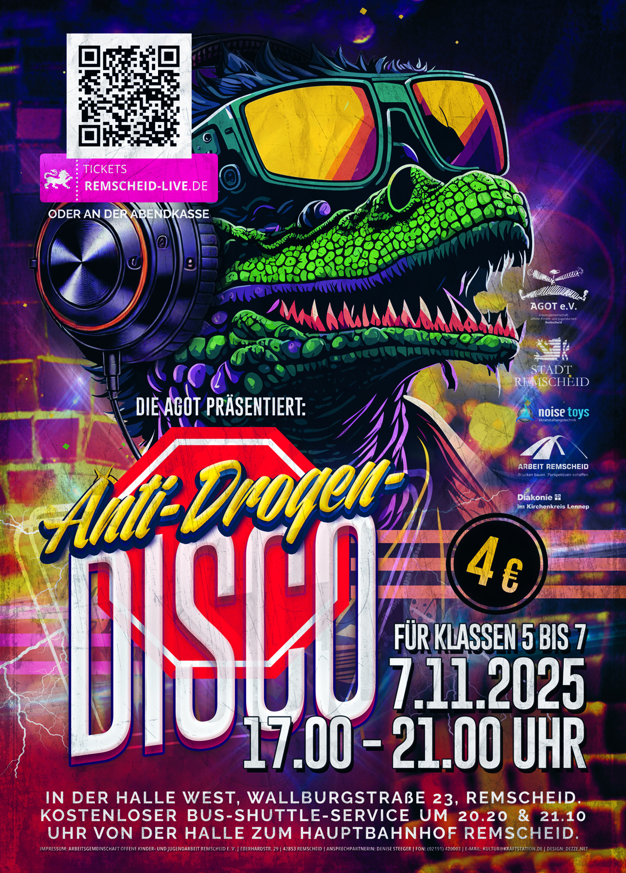 Am Freitag, den 7. November 2025, findet in der Halle West (Wallburgstraße 23, Remscheid) von 17.00 bis 21.00 Uhr die beliebte Anti-Drogen-Disco (ADD) für Schülerinnen und Schüler der Klassen 5 bis 7 statt. Die Veranstaltung zeigt, dass man auch ohne Alkohol und Rauschmittel eine tolle Party feiern kann.