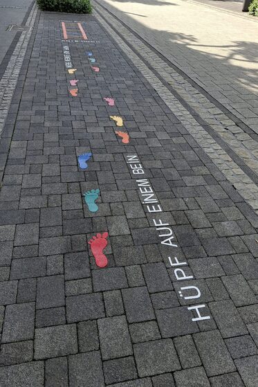 Auf rund 30 Metern Länge verwandelt sich das Pflaster auf der unteren Alleestraße (vor den Häusern 29, 41 und 49) in eine fantasievolle Bewegungsstrecke. Diese fördert den natürlichen Spieltrieb und bringt auf spielerische Weise Bewegung in den Alltag.
