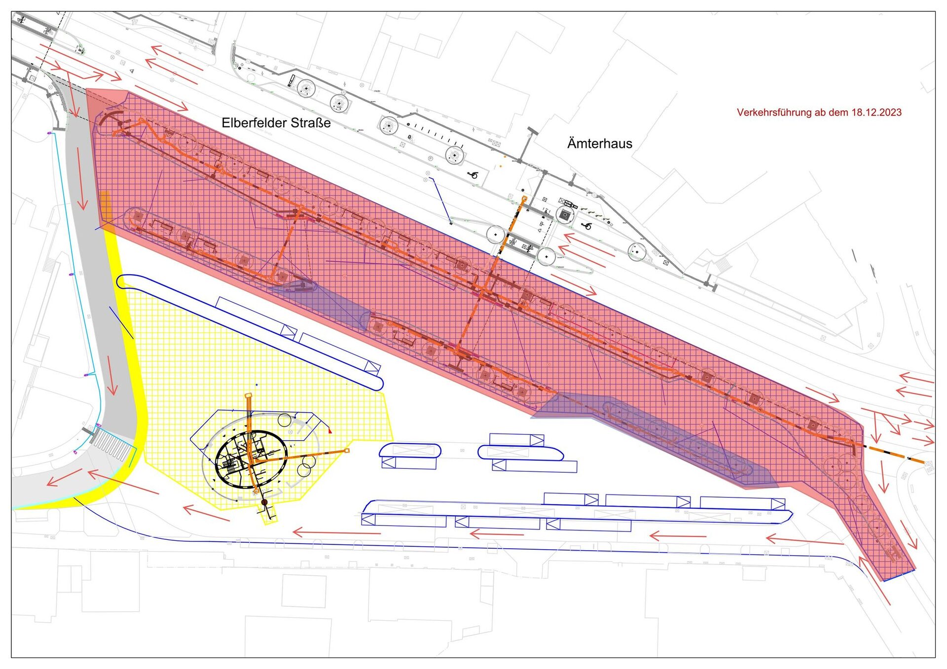 In der umgekehrten Richtung, d.h. vom Allee-Center Richtung Bahnhofskreisel, wird es wie in den letzten Wochen auch einen Fahrstreifen geben. Der große Unterschied wird sein, dass die Verkehrsführung wieder geradlinig über die Elberfelder Straße laufen wird. Der Verwaltung war es ein besonderes Anliegen, dass diese Änderung der Verkehrsführung noch vor den Feiertagen erfolgt, weil der Verkehr dadurch deutlich leichter und flüssiger fließen wird.