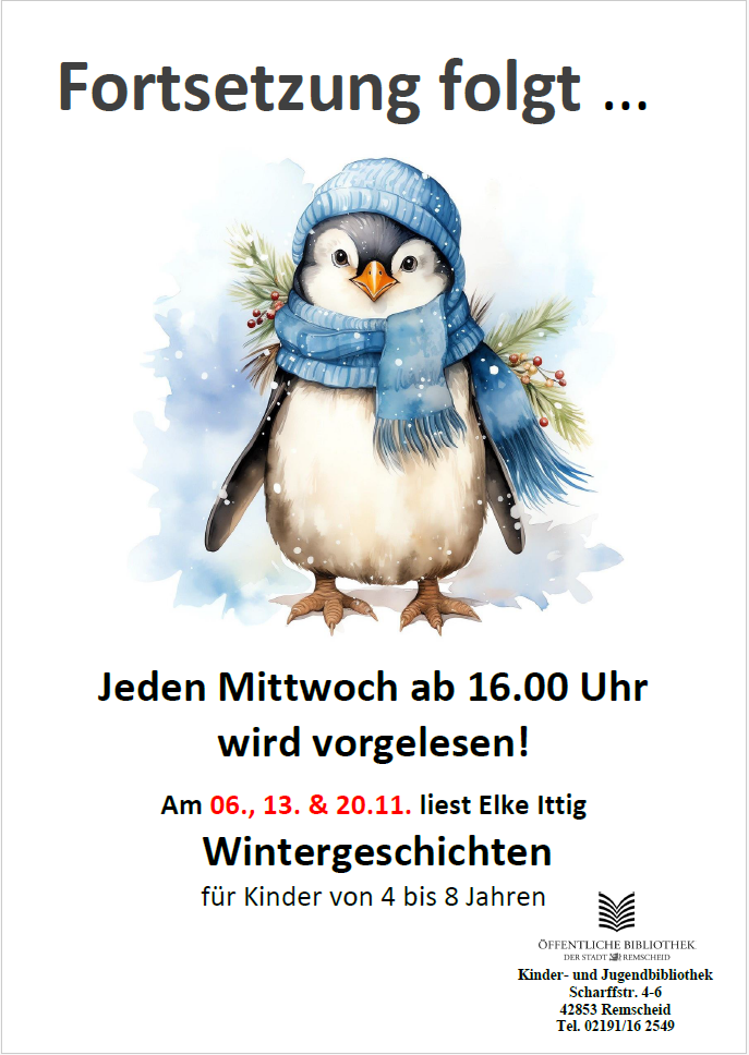 In den kommenden Wochen (13. und 20. November) können sich Kinder im Alter von 4 bis 8 Jahren auf spannende Wintergeschichten, vorgetragen von Elke Ittig, freuen.
