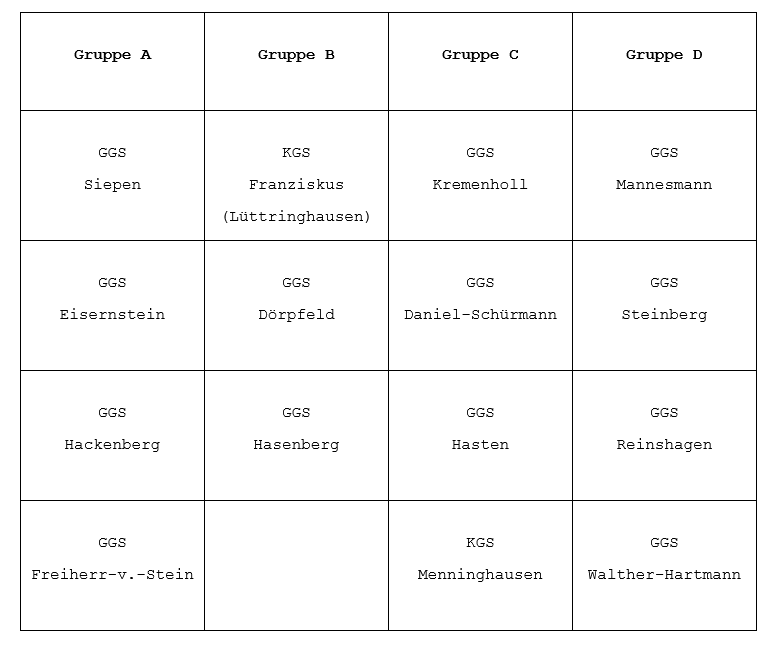 Die Auslosung der Vorrundengruppen erfolgte in der Geschäftsstelle des Ausschusses für den Schulsport in der Stadt Remscheid und ergab folgende Einteilung: