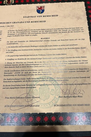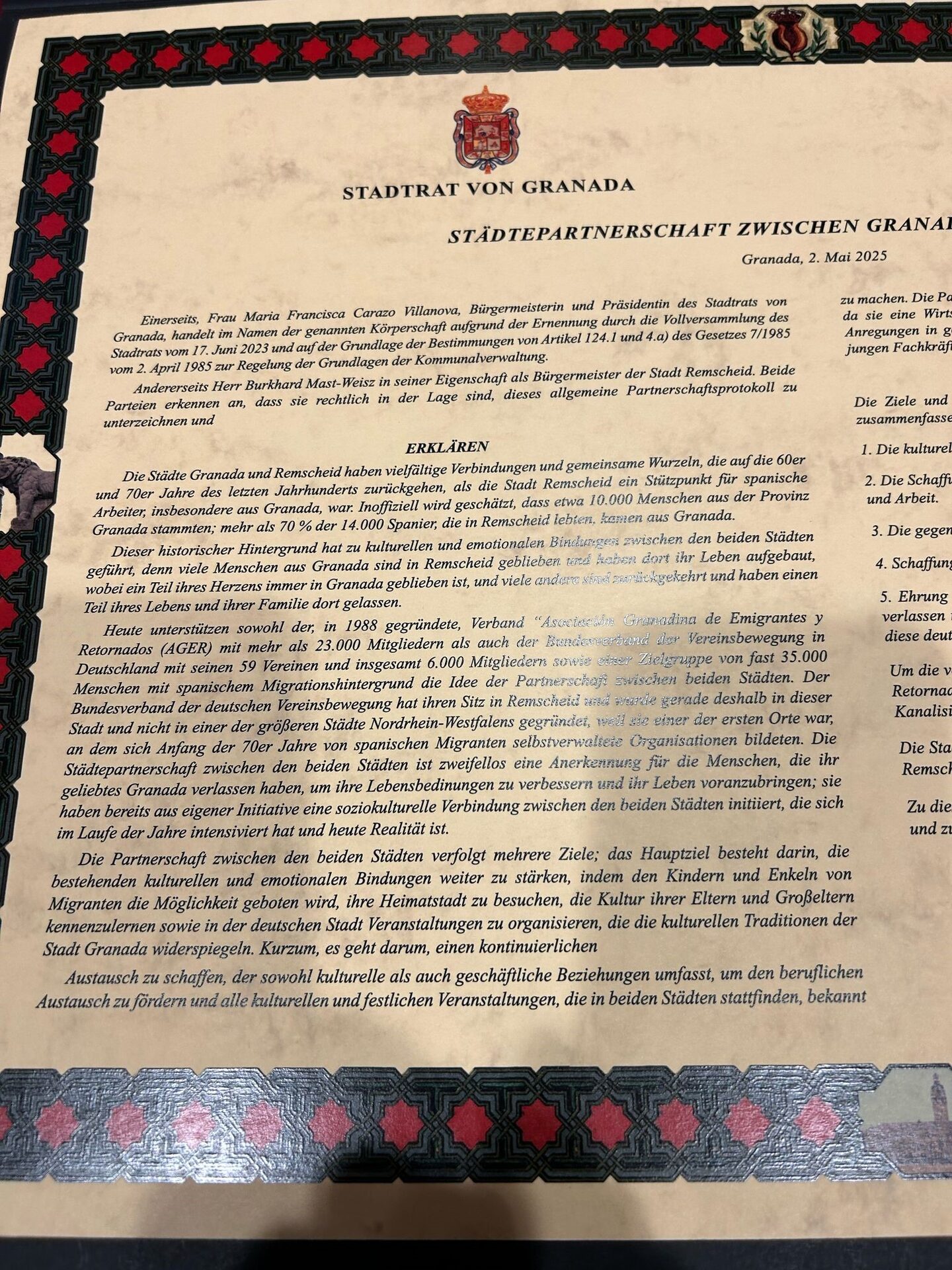 Die Zeremonie fand im Rahmen eines offiziellen Treffens in Granada statt, bei dem Frau Maria Francisca Carazo Villanova, Bürgermeisterin und Präsidentin des Stadtrats von Granada, gemeinsam mit Oberbürgermeister Burkhard Mast-Weisz die Partnerschaftsurkunde unterzeichneten.