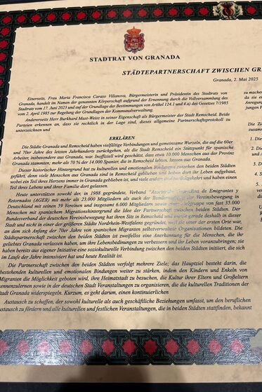 Die Städte Granada und Remscheid pflegen vielfältige Verbindungen und Wurzeln aus den 1960er und 1970er Jahren, als die Stadt Remscheid eine Hochburg für spanische Arbeiter, insbesondere aus Granada, war. Inoffiziellen Schätzungen zufolge kamen etwa 10.000 Menschen aus der Provinz Granada. Mehr als 70 % der 14.000 Spanier, die in Remscheid lebten, kamen aus Granada.