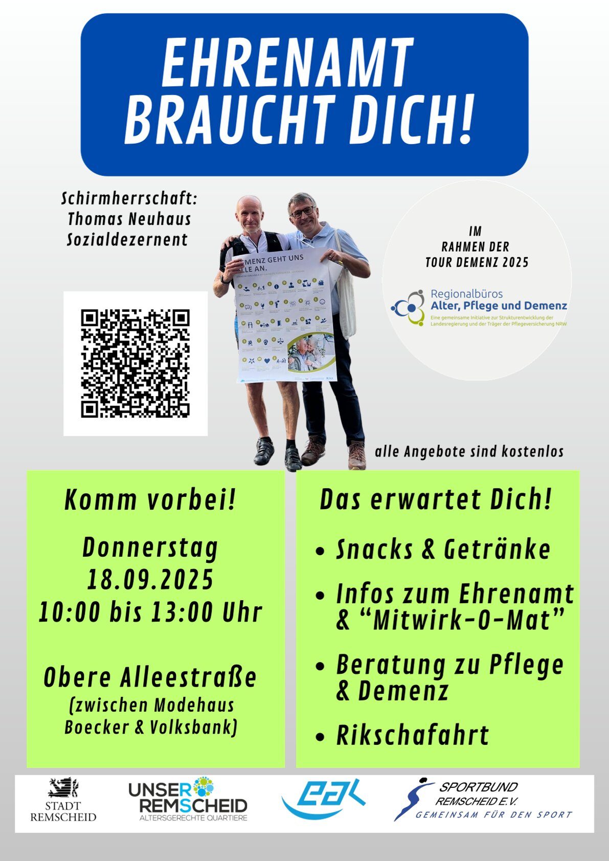 Die diesjährige Tour Demenz (Mittwoch, 17. September und Donnerstag, 18. September) steht ganz im Zeichen des Ehrenamts. Die Fahrt ist eine wichtige Maßnahme des Regionalbüros Alter, Pflege und Demenz Bergisches Land und wird in jeweiligen Städten inhaltlich durch Akteure aus dem Netzwerk des Regionalbüros ausgefüllt. Am Donnerstag, 18. September, machen die Radfahrenden der Tour auch in Remscheid Halt. Voraussichtlich im Zeitraum von 11 bis 11:30 Uhr werden die Fahrradfahrerinnen und Fahrradfahrer auf der oberen Alleestraße (zwischen Modehaus Boecker und der Volksbank) feierlich in Empfang genommen. Davor und danach (10 bis 13 Uhr) bietet die Altersgerechte Quartiersentwicklung der Stadt Remscheid zusammen mit der Ev. Alten- und Krankenhilfe Remscheid in enger Zusammenarbeit mit dem Sportbund Remscheid sowie weiteren Netzwerkpartnern ein vielseitiges und abwechslungsreiches Angebot. Die Veranstaltung richtet sich an Erkrankte, Angehörige, ehrenamtlich Engagierte sowie Interessierte. Selbstverständlich freuen sich die Organisatoren auch über die Teilnahme von Fachkräften aus dem Pflege- und Unterstützungsbereich.