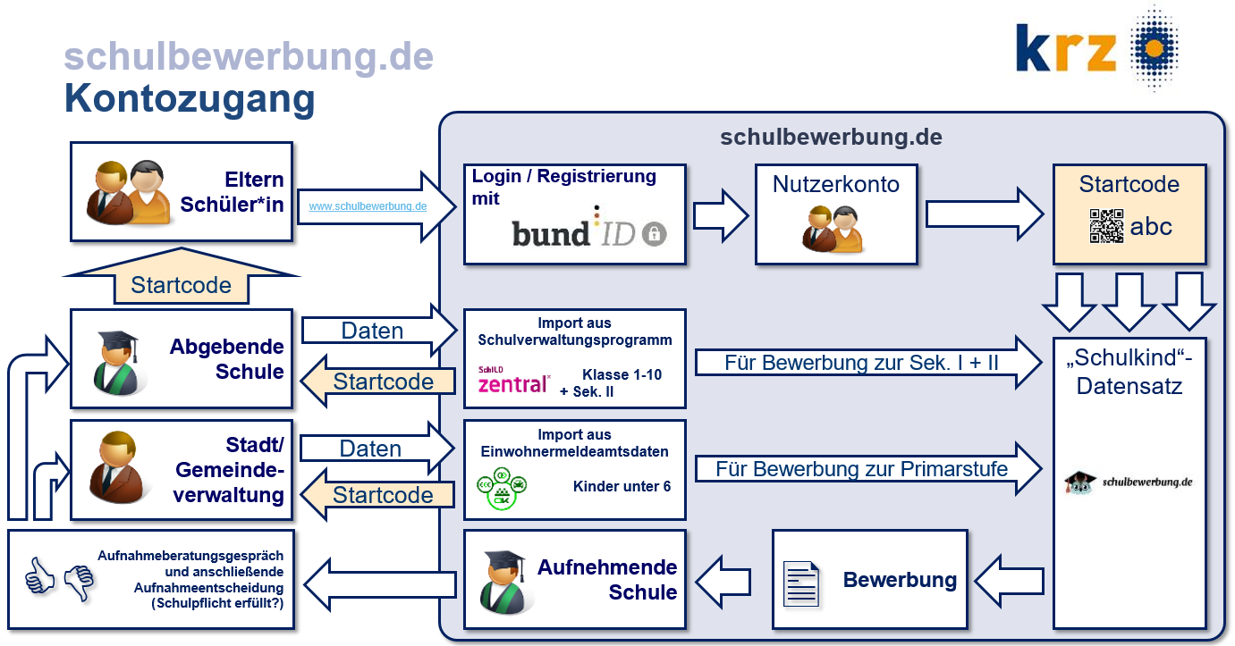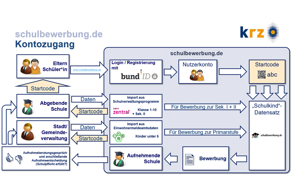 Die Grunddaten der Schülerin/des Schülers wurden bereits über die abgebende Schule in Schulbewerbung.de verankert. Die Eltern müssen somit nur eine Bund-ID zur Authentifizierung in Online-Portalen erstellen und danach die Anmeldung ihres Kindes in Schulbewerbung.de vornehmen.