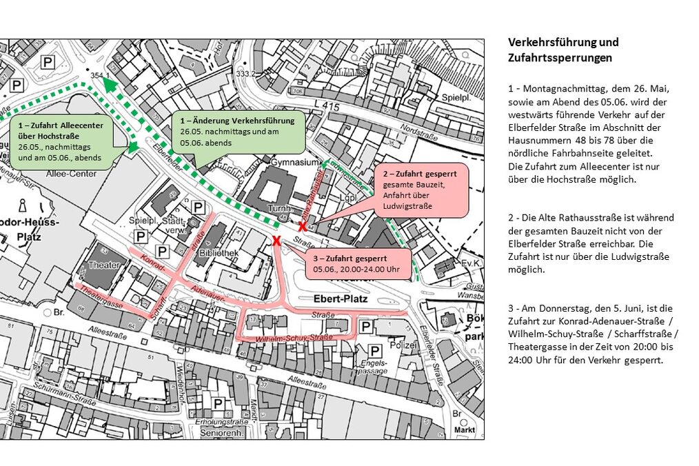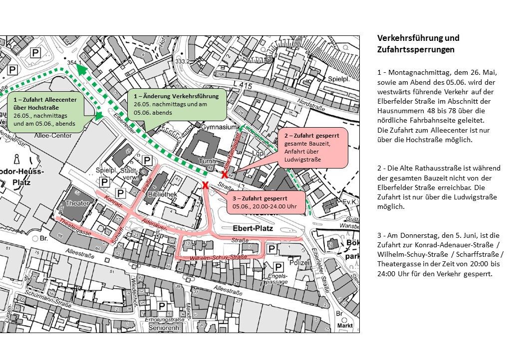 Bitte beachten Sie, dass die Alte Rathausstraße während der gesamten Bauzeit nicht mehr direkt von der Elberfelder Straße aus erreichbar ist. Sie wird in dieser Zeit zur Sackgasse und ist ausschließlich über die Ludwigstraße anfahrbar.