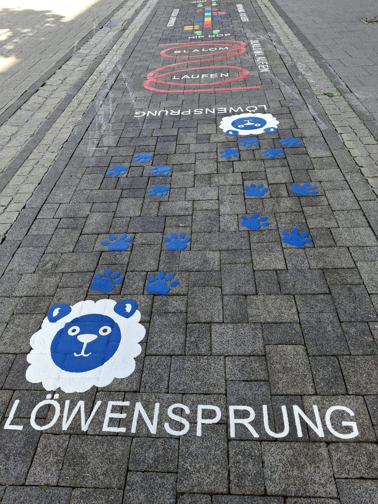 Auf rund 30 Metern Länge verwandelt sich das Pflaster auf der unteren Alleestraße (vor den Häusern 29, 41 und 49) in eine fantasievolle Bewegungsstrecke. Diese fördert den natürlichen Spieltrieb und bringt auf spielerische Weise Bewegung in den Alltag.