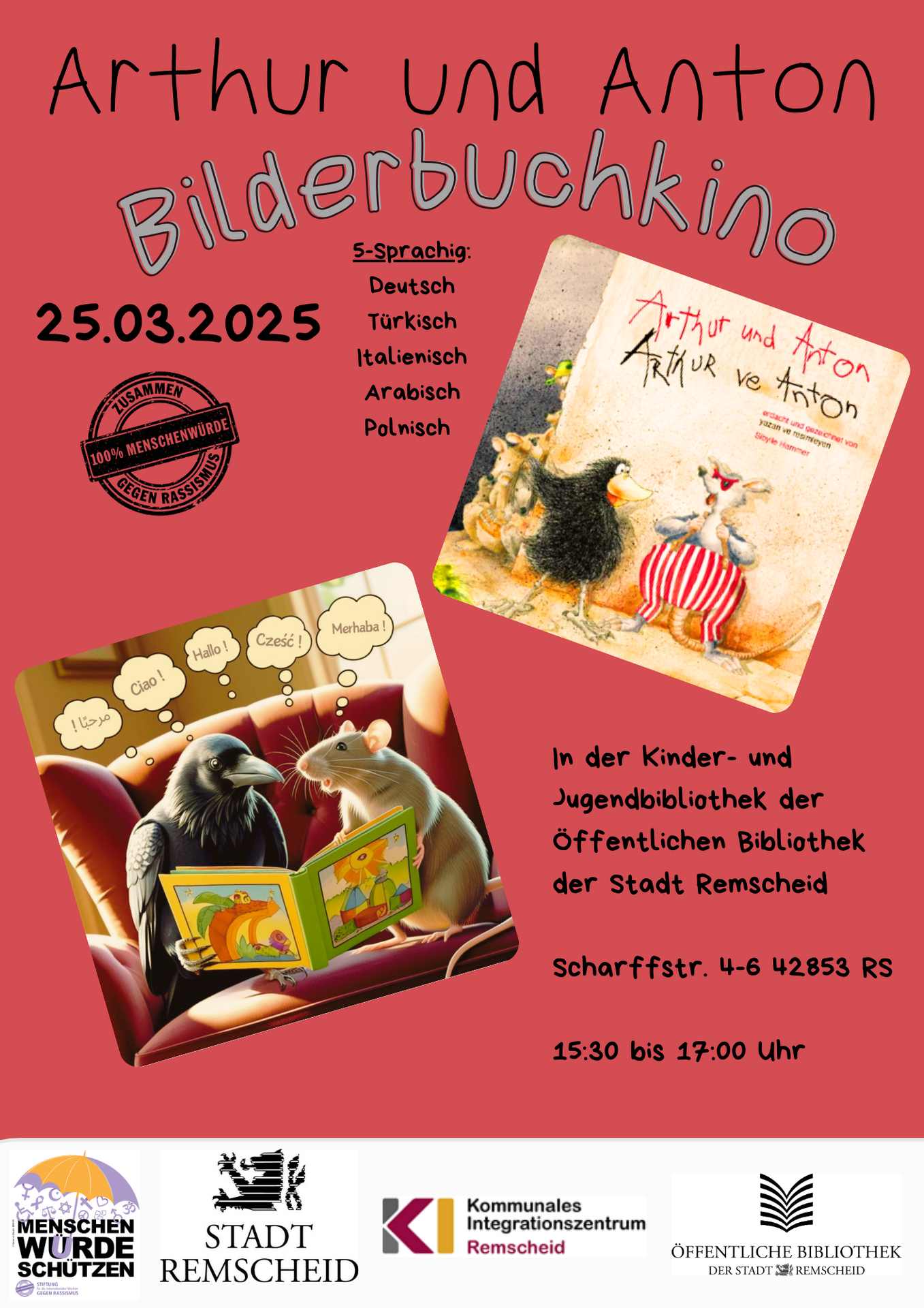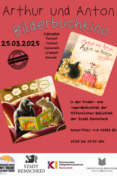 Ehrenamtliche Sprachmittlerinnen des Sprachmittler Pools des Kommunalen Integrationszentrums erwecken die Freunde Arthur und Anton in unterschiedlichen Herkunftssprachen zum Leben. Bilderbücher fungieren dabei als Brücke zwischen Kulturen, fördern den Spracherwerb und verdeutlichen, wie bereichernd Vielfalt sein kann.