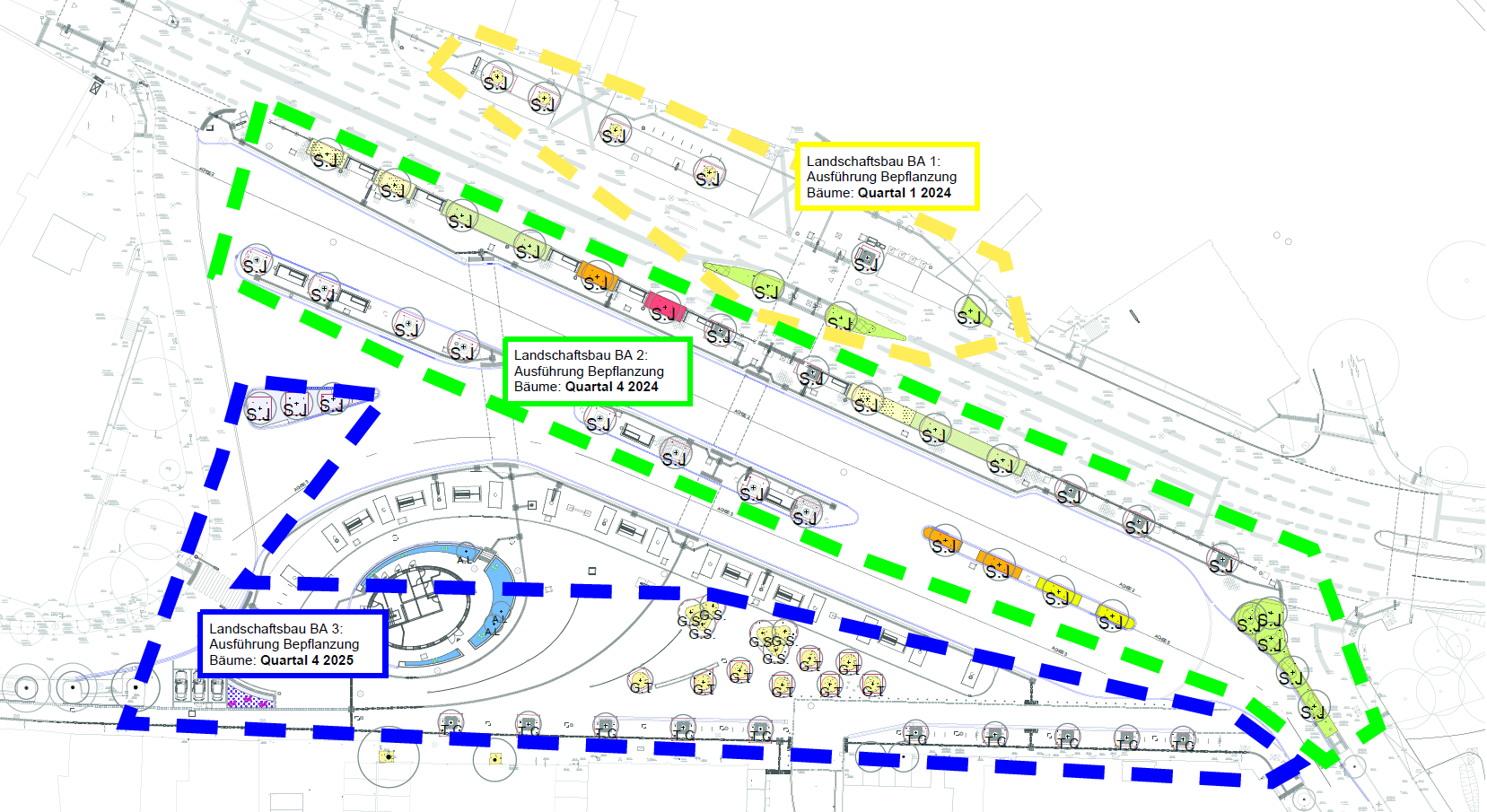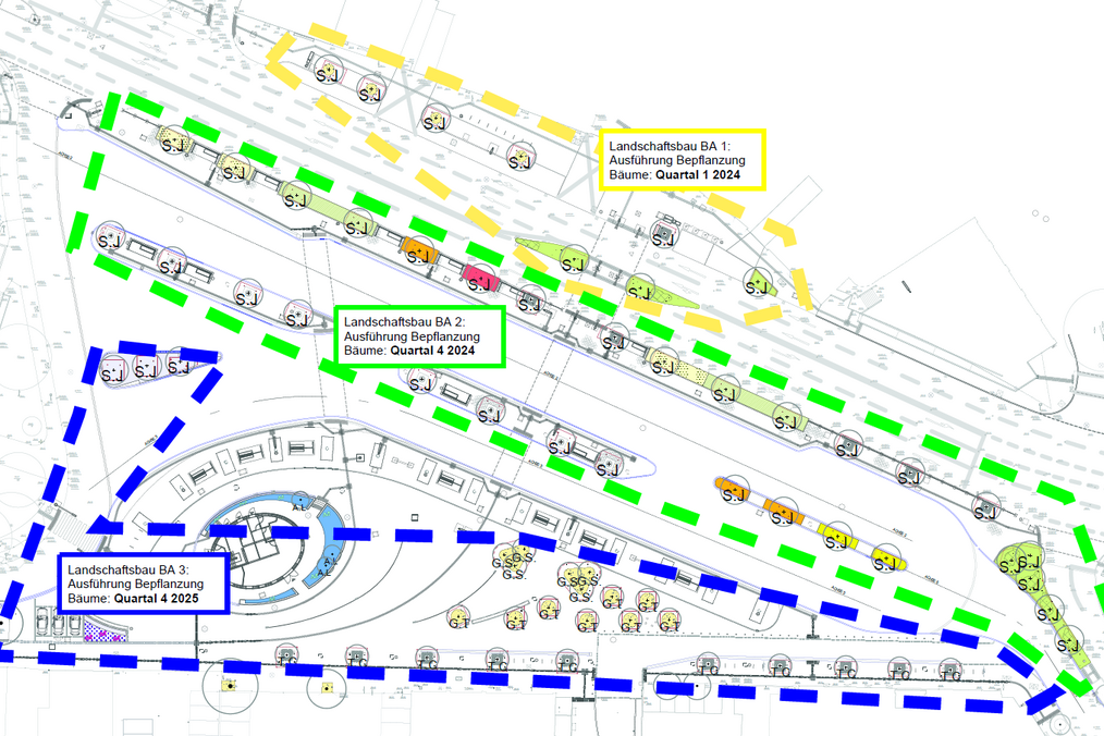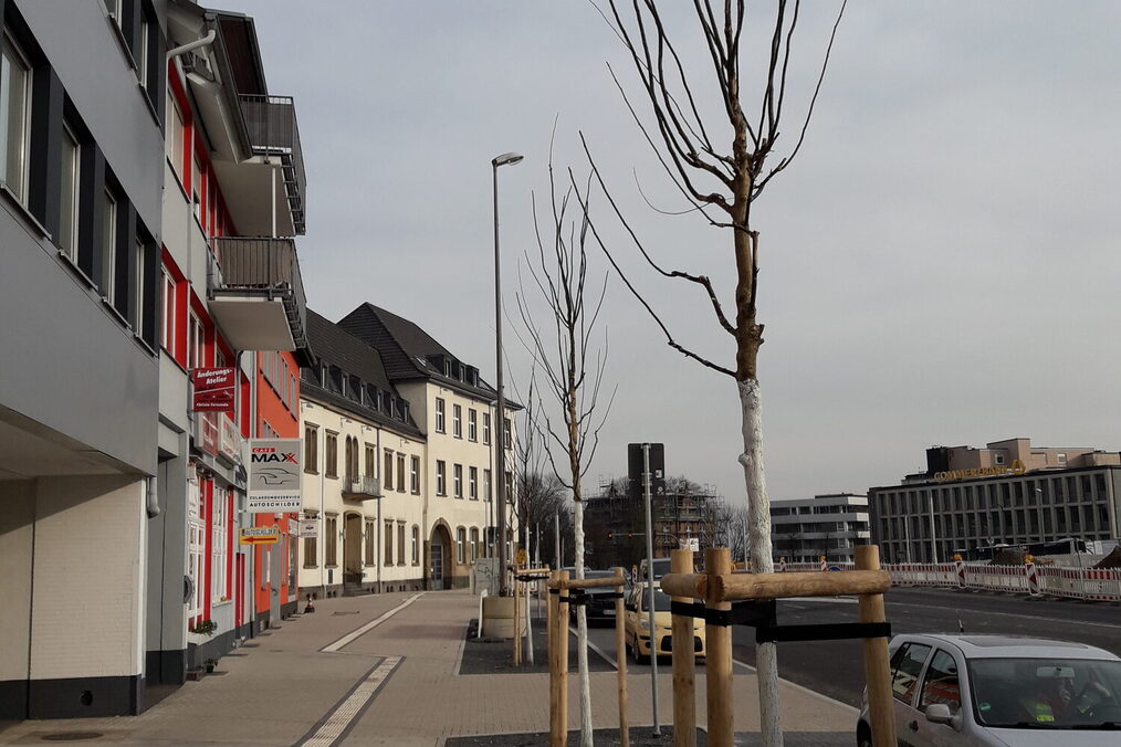 Ende Februar wurden nun planmäßig die ersten acht japanischen Schnurbäume im 1. Pflanzabschnitt im nördlichen Bereich an der Elberfelder Straße eingesetzt. Bis Ende dieses Jahres folgen 31 weitere japanische Schnurbäume im bis dahin fertiggestellten nördlichen Bereich des neuen Busbahnhofs entlang der Bussteige. Bis Ende 2025 folgen noch 27 weitere Bäume.