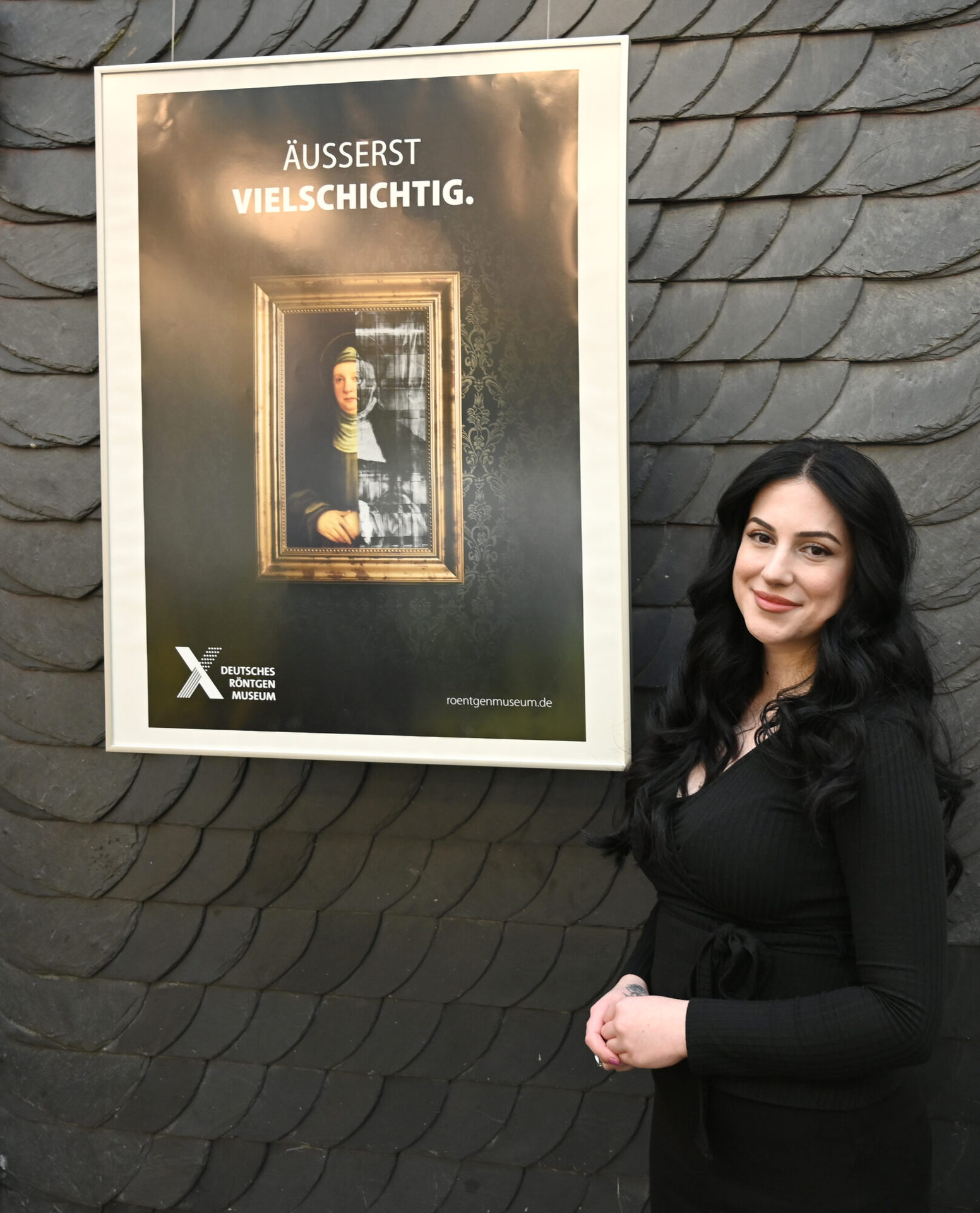 Das Deutsche Röntgen-Museum versteht sich als ein Ort, an dem Menschen verschiedener Generationen gemeinsam kreativ arbeiten. 2024 wurde erstmals eine Ausbildungsstelle für Mediengestaltung eingerichtet. Seitdem bringt die Auszubildende Dimitra Tompolidou frische Ideen in die Grafik und Öffentlichkeitsarbeit ein. Im Rahmen eines Schulprojekts hat sie ein Poster zum Thema Röntgenstrahlung gestaltet. Es zeigt ein Objekt, das halb normal und halb per Röntgenbild dargestellt ist – ein anschaulicher Blick auf das Zusammenspiel von äußerer Form und innerer Struktur. Ihr Werk macht deutlich, wie gut sich komplexe Wissenschaft durch gutes Design erklären lässt.