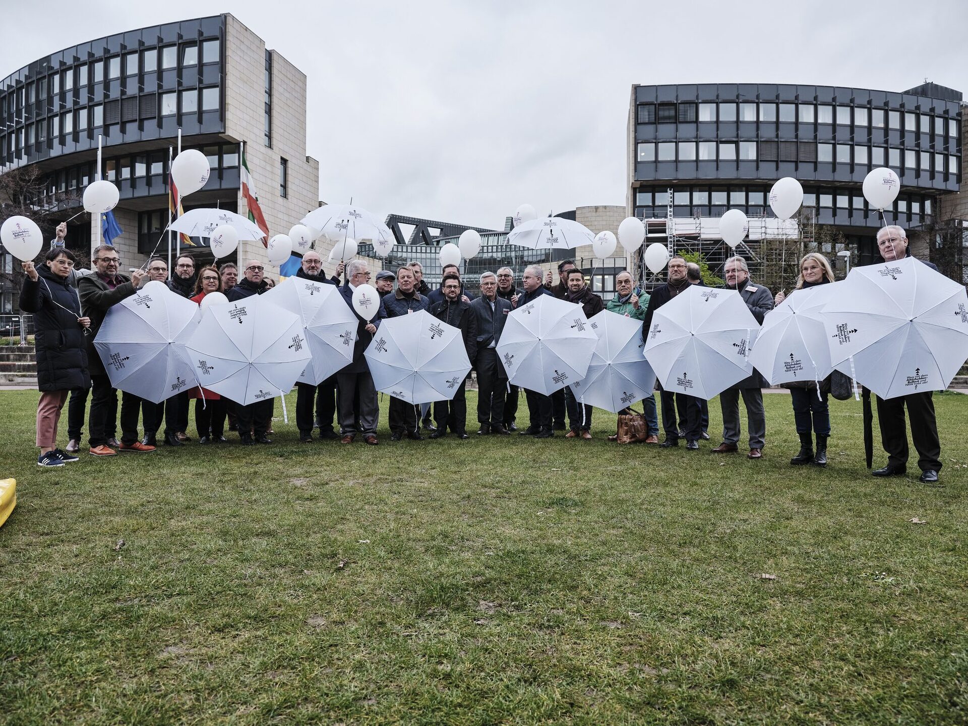 Ballon und Botschaft konnte niemand übersehen. Das Aktionsbündnis „Für die Würde unserer Städte“ hat am Mittwoch (6. April) mit einem zehn Meter hohen Gasballon auf der Wiese vor dem NRW-Landtag demonstriert. Die zentrale Forderung der dort versammelten Oberbürgermeisterinnen und Oberbürgermeister, Bürgermeisterinnen und Bürgermeister, Kämmerinnen und Kämmerer schwebte in großen Buchstaben vor dem Parlament: „Weg mit dem Altschuldenballast – und NRW hebt ab“. Die Aktion beeindruckte auch die Mitglieder des Landtags. Zahlreiche Abgeordnete suchten das Gespräch mit den Vertreterinnen und Vertretern der Kommunen, darunter CDU-Fraktionschef Bodo Löttgen, der SPD-Spitzenkandidat für die Landtagswahl, Thomas Kutschaty, und die Vorsitzende der Grünen-Fraktion, Josefine Paul.