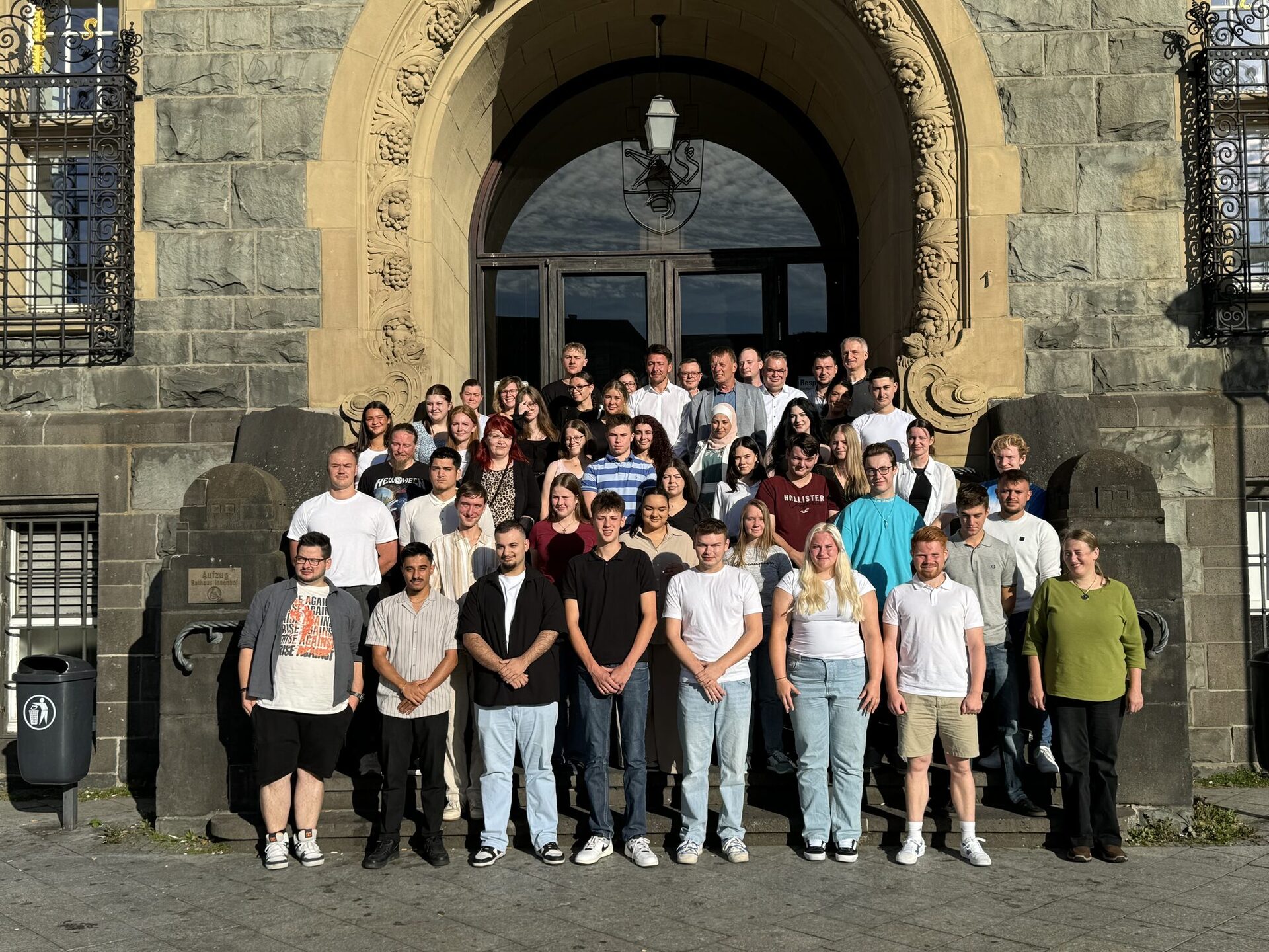 Oberbürgermeister Burkhard Mast-Weisz mit weiteren Vertretern der Verwaltungsspitze, Personalratsvorsitzender Torsten Helbig und Ausbilder Roland Wegmann begrüßten die neuen Auszubildenden am 12. August im Großen Ratssaal des Remscheider Rathauses. Bereits in der vergangenen Woche ging es für die Nachwuchskräfte zu einer mehrtägigen Einführungsveranstaltung nach Hattingen – gespickt mit allem Wissenswerten rund um das Thema „Ausbildung bei der Stadt Remscheid“ und viel Gelegenheit zum gegenseitigen Kennenlernen.