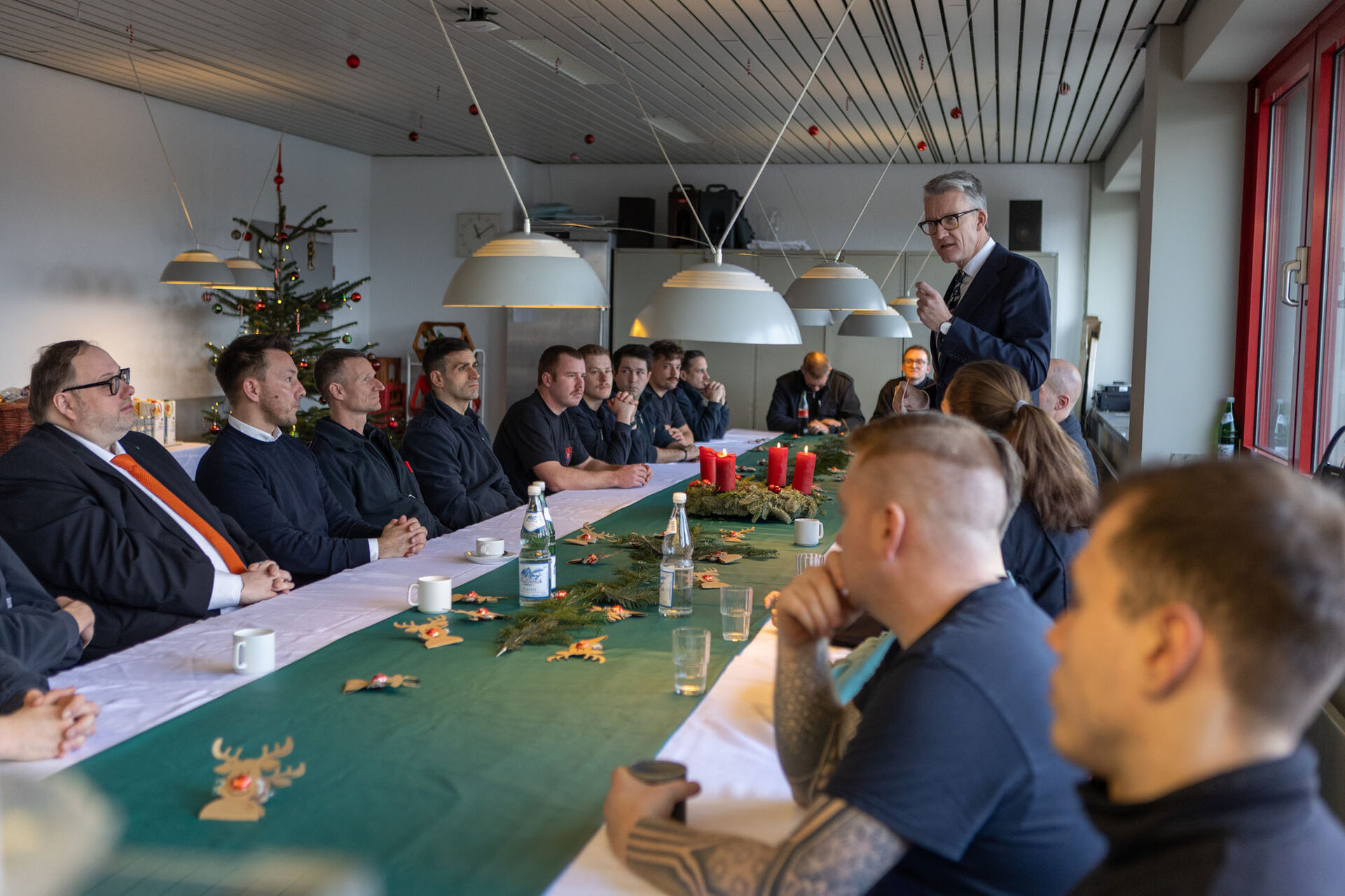 Viele Remscheiderinnen und Remscheider feiern Heiligabend im familiären Kreis nach besonderen Traditionen. Seit mehr als 15 Jahren gehört es für mich dazu, am Morgen des Heiligabends die Feuerwehr zu besuchen. Als Abgeordneter durfte ich verschiedene Oberbürgermeister begleiten. Nie hätte ich mir träumen lassen, selbst als Oberbürgermeister zur Feuerwehr zu fahren. Im Namen aller Remscheiderinnen und Remscheider danke ich Ihnen für Ihren unermüdlichen Dienst. Sie und Ihre 2.500 Kolleginnen und Kollegen in der Stadtverwaltung haben im vergangenen Jahr jeden Tag Großes geleistet. Das verdient Respekt und Anerkennung. Zugleich danke ich Ihnen für das Vertrauen und die Offenheit, die Sie mir als neuem Oberbürgermeister entgegenbringen.
