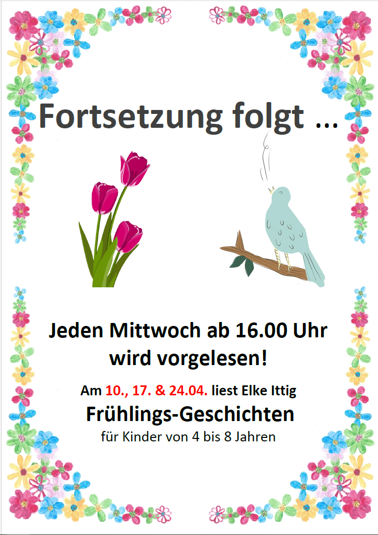 In den kommenden Wochen (10.,17. und 24. April) können sich Kinder im Alter von 4 bis 8 Jahren auf spannende Frühlingsgeschichten, vorgetragen von Elke Ittig, freuen.