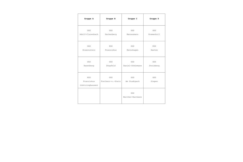 Die Auslosung der Vorrundengruppen erfolgte in der Geschäftsstelle des Ausschusses für den Schulsport in der Stadt Remscheid und ergab folgende Einteilung: