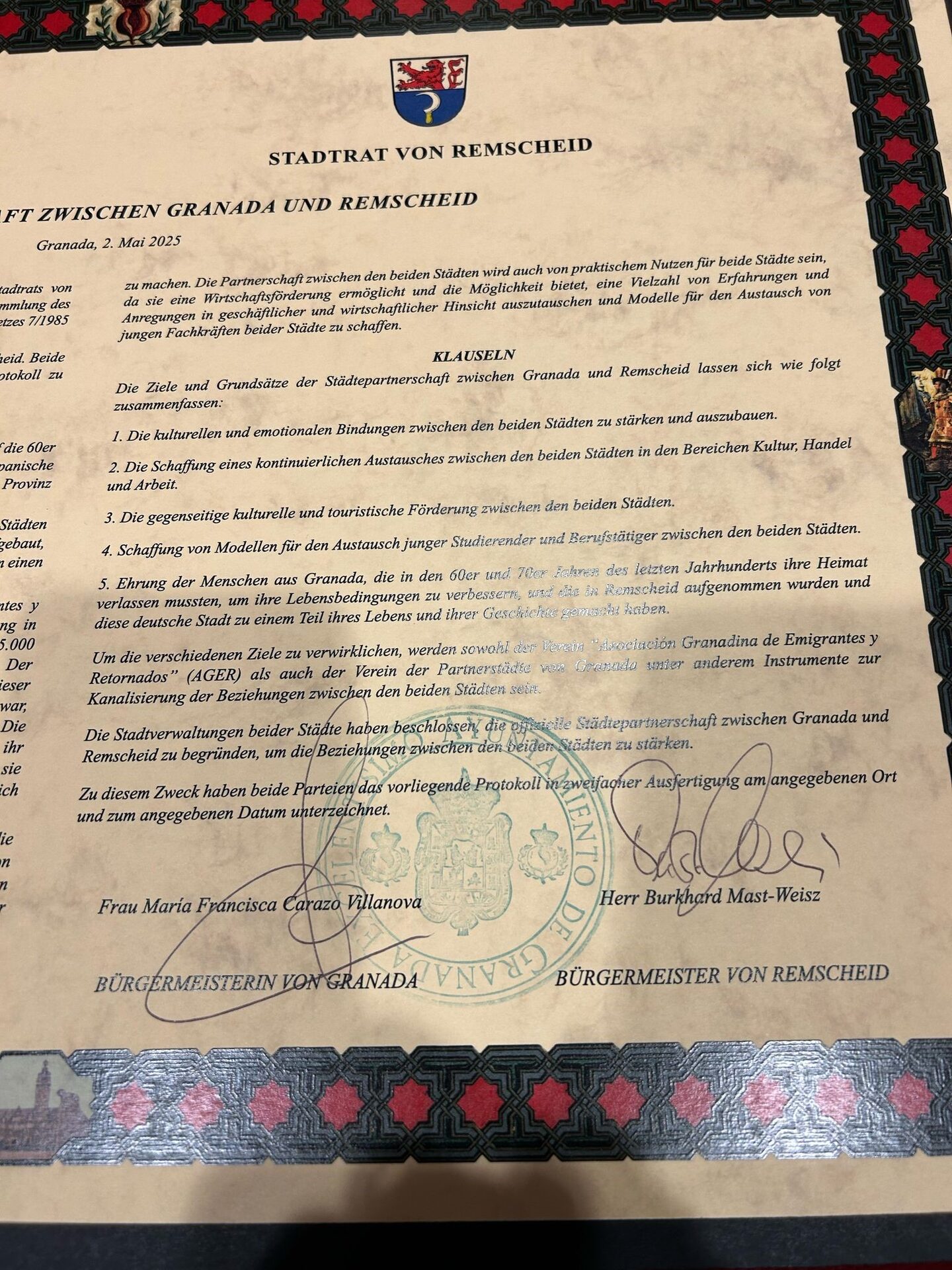 Die Zeremonie fand im Rahmen eines offiziellen Treffens in Granada statt, bei dem Frau Maria Francisca Carazo Villanova, Bürgermeisterin und Präsidentin des Stadtrats von Granada, gemeinsam mit Oberbürgermeister Burkhard Mast-Weisz die Partnerschaftsurkunde unterzeichneten.