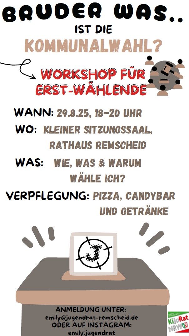 Die Erstwahl ist ein bedeutender Schritt in die politische Teilhabe. Viele wissen gerade bei der Kommunalwahl nicht, wie das Verfahren abläuft, worüber abgestimmt wird und warum ihre Stimme zählt. Der Workshop richtet sich an alle, die zum ersten Mal wählen, und beantwortet die zentralen Fragen: Wie wähle ich? Was wähle ich? Warum wähle ich?